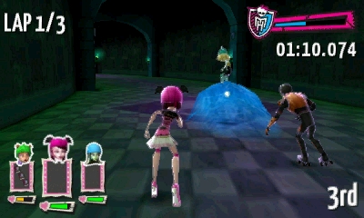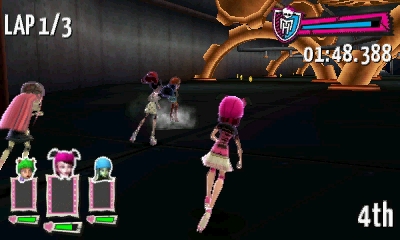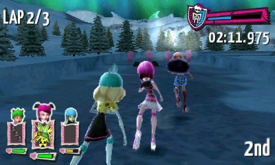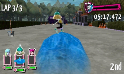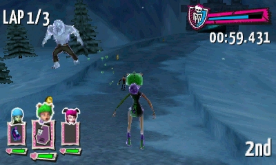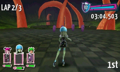 At the thought of playing a new Monster High game she was really excited until she found out it was a racing game. The game is well presented and makes good use of artwork of the Monster High characters and the depth of the 3D screen. The main menu can be controlled via the face buttons or the touch screen and allows you to jump into racing, change the options, view your unlocks and track records.