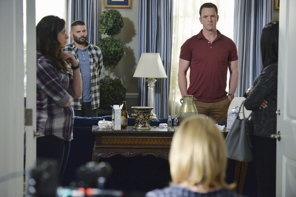 The fixer was located by Quinn (Katie Lowes) who informed her about Harrison's (Columbus Short) death. Olivia returned for the funeral promising Jake that she would return to the island with him once it had taken place. Olivia's return wasn't greeted with the warm welcome she anticipated with Huck (Guillermo Diaz) working in an electronics store with a lot of pent up anger and Abby (Darby Stanchfield) working as the White House Press Secretary and wanting nothing to do with her former best friend.