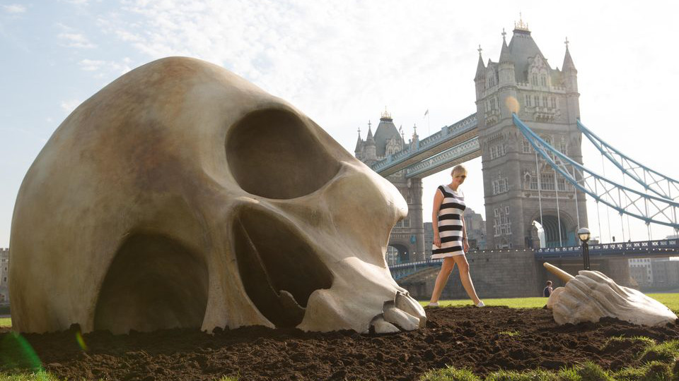 A two-metre high installation of a human skull mysteriously appeared on London’s South Bank this morning complete with forensic investigators and cordoned off by police tape.
