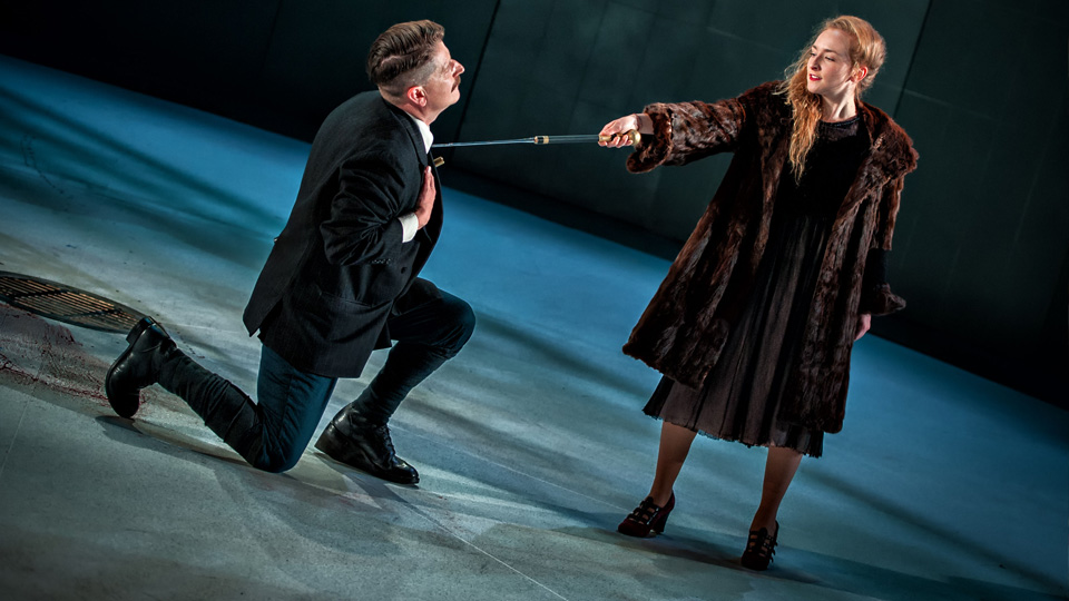 The play is particularly well visualised with a bold, dystopian production design from Conor Murphy. Towering flattage immediately provides a grand sense of scale to the court which towers over the performers and audience. Predominantly slate grey, it is an Orwellian setting with details which evoke a slaughterhouse or medical arena. A stainless steel drain in the centre of the stage acts as a grim reminder to the blood which is continually split and rinsed away. The drama is also exceptionally well lit, with a trio of inset circles of lighting truss flown above the stage, turning and lowering throughout the action and occasionally symbolising three fallen crowns.