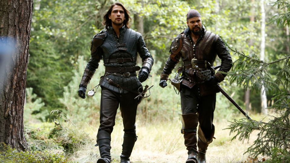 During the speech the musketeers were shown and they each initially appeared in danger before it was revealed that they were not. Athos (Tom Burke) looked to be held at gunpoint but it was just Sylvie (Thalissa Teixeira) and they slept together. D'Artagnan (Luke Pasqualino) seemed to have a knife at his throat while in the bath but it was Constance (Tamla Kari) shaving him. Aramis (Santiago Cabrera) was blindfolded but he wasn't held captive, instead he was gambling with Porthos (Howard Charles) and making money by shooting bottles out of the air.