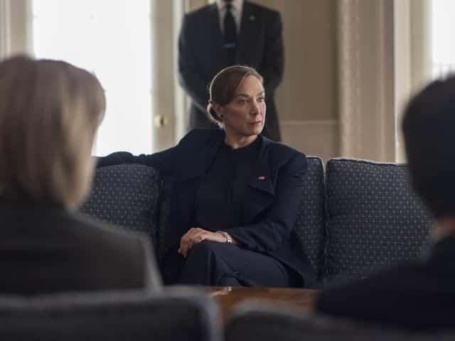 President Keane (Elizabeth Marvel) was briefed about the situation in Virginia. Saul gave his theory that the Russians might be behind the fake news and cited information warfare. The President was more concerned with fixing the current rioting problems.
