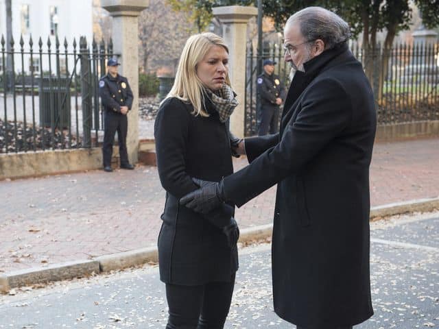 The episode opened up with Saul (Mandy Patinkin) arriving at the FBI building in Virginia. Following the chaos of the assault on the Elkins compound, where 16 adults and 3 kids lost their lives, the community were angry. Saul looked nervous in the back of his vehicle as he was transported through the crowds of angry protestors.