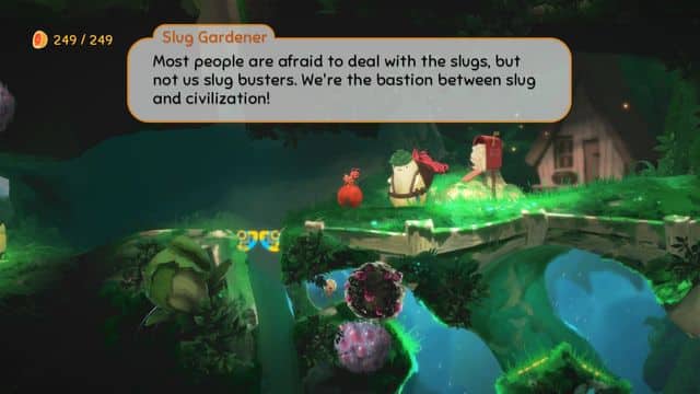 Yoku's Island Express also dazzles with its insanely adorable and colourful graphics. The backgrounds of the levels are lush and well put together–plenty of attention to detail that shows. The characters you interact with could easily be turned into a cuddly plush toy. The animation is a treat to witness and exudes the fact that it was made with love, along with a fitting and bouncy soundtrack to round it out for the rest of the senses. I feel like I could easily be playing a Saturday morning cartoon with Yoku's Island Express, and am over the moon I can step into the world myself!