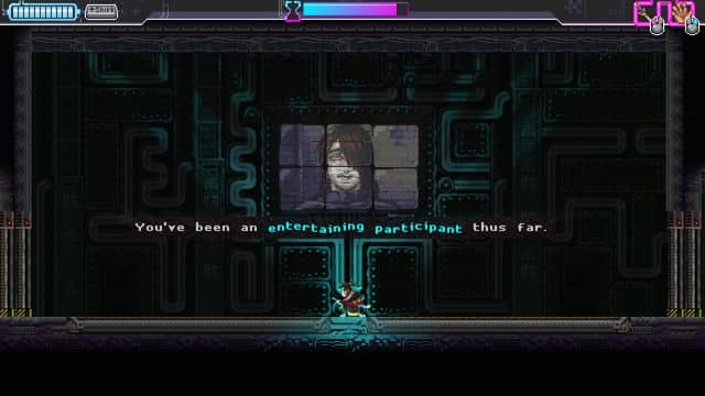 Katana ZERO houses some mechanics that easily get you to melt into the role of your assassin. Overhead hints encourage to slow down time; something that feels a bit like a cheat, but progressing–is something that must be relied on. Each stage in Katana ZERO is a dance with precision and flair–no style points are awarded, but in your own mind…and with the VHS playback of your board completion, you might find yourself encouraged to take everyone out in a spectacular display.
