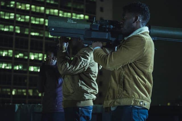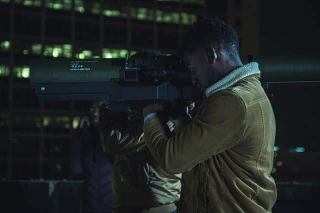 Credit: Gareth Gatrell / Tiger Aspect Productions Limited 2018 – Ike Bennett (playing Roman Donahue), Sean Bean (playing The General) and Malachi Kirby (playing Michael Garwick)