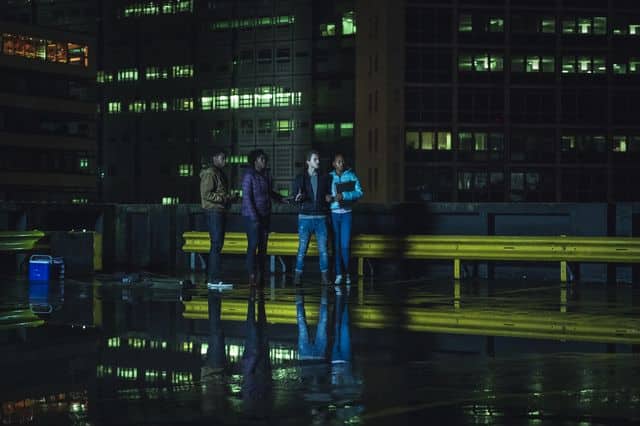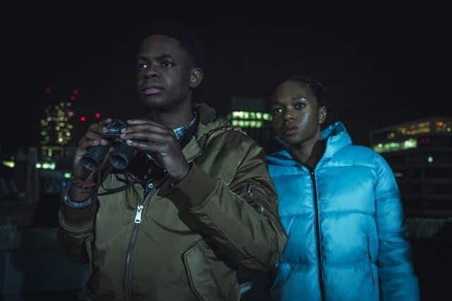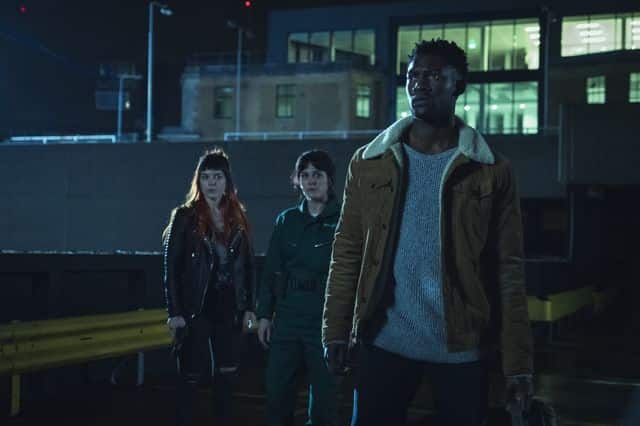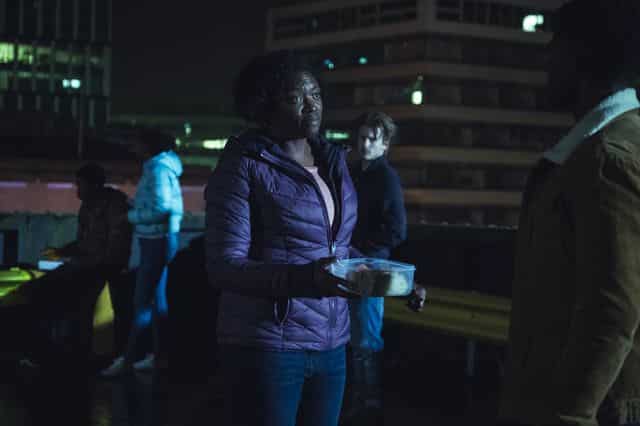 Credit: Robert Viglasky / Tiger Aspect Productions Limited 2018 – Phoebe Fox (playing Kaye Newman), Malachi Kirby (playing Michael Garwick) and Aimee-Ffion Edwards (playing Ruby Newman)