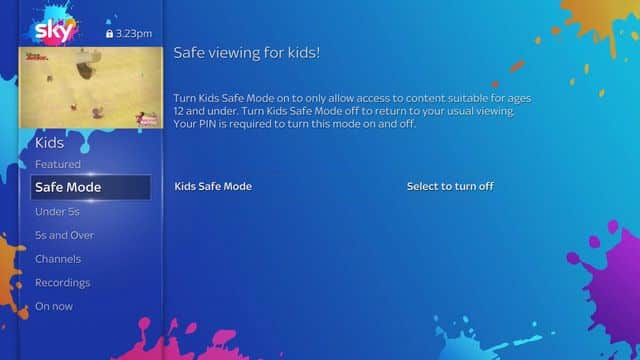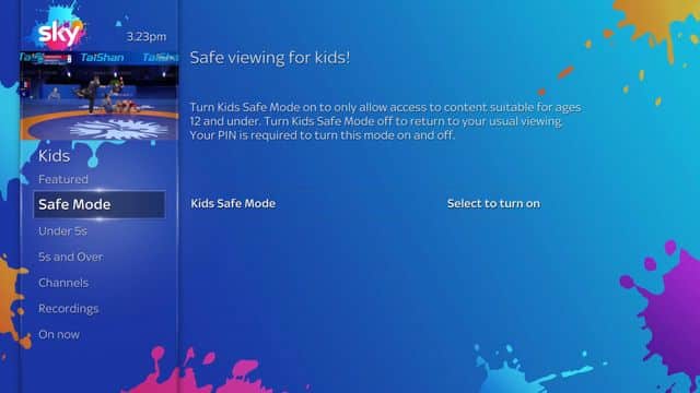 Kids Safe Mode can be activated on any Sky Q box in the home, allowing parents to watch their favourite shows in one room and the kids to watch TV safely in another. Best of all is that Kids Safe Mode will still be enabled after switching your box on from standby, re-boot or power failure.