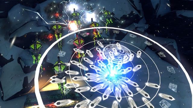 In Pawarumi, the action is set in a futuristic universe with structures that are inspired by pre-Columbian architecture. Players take the role of a female pilot named Axo. She's seeking revenge for some betrayal against the people of Earth. To do this she's in control of Chukaru, a holy spaceship with unique abilities.