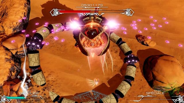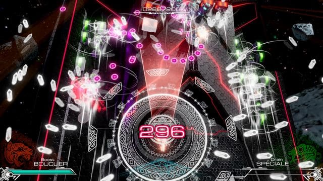 For the more advanced strategies things get a little more complicated. Shooting your weapons falls into one of three categories – Boost, Crush or Drain. These are shown across the bottom of the screen with Boost and Drain having their own meters. They also change colour to correspond to the weapon that you are firing.