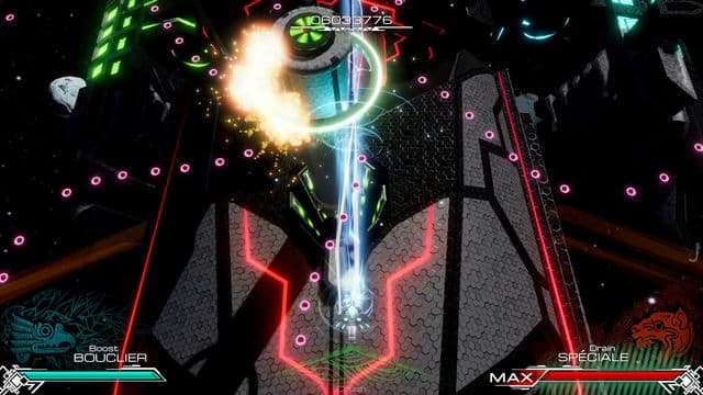 Boost is the simplest to understand and requires you to shoot enemies with the weapon that matches their colour. So for example you'd shoot a green enemy with the Condor laser. Doing so recharges your Shield meter. The safest way to play is to ensure that you keep your shields topped up at all times.