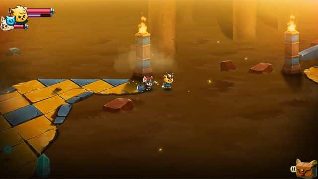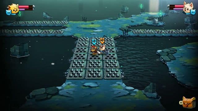 Cat Quest II is set up for feline dungeon crawling with a variety of mechanics inside each said dungeon. You'll have to manoeuvre around spike traps and different enemies as things get a bit tougher–a great deal of this revolving around hack and slash style gameplay. You can equip your duo with things such as mage staffs and take the ranged road if you like, but don't forget the other side of your move set that is imperative: the dodge roll. This roll will get you out of a lot of trouble. Most enemies have a warning system that Cat Quest II so mercifully gave: a little red circle will appear and act as a timer before the enemy themselves attack. It's a small window that gives you enough time to immediately pull a roll. The roll is nicely done in a way that if you press the roll on it's own, it automatically will dodge backwards.