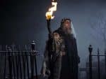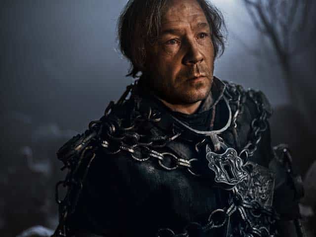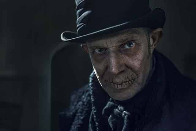 Scrooge’s dead former business partner Jacob Marley (Stephen Graham) begs for peace in his coffin. Having repented himself, the Spirits have news for him. He will linger in purgatory until Scrooge himself repents, something Marley knows he will never do.